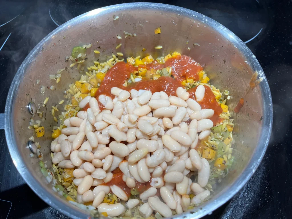 6. Add beans and vegetable stock; bring to a simmer for 9 to 10 minutes, until orzo is tender.