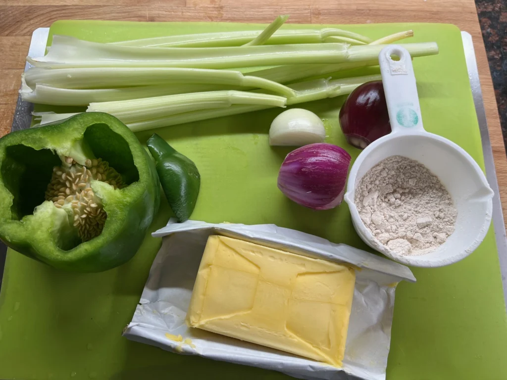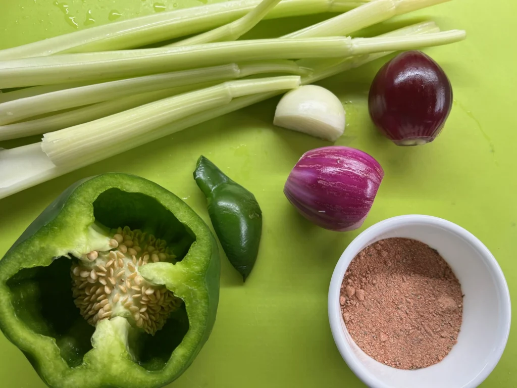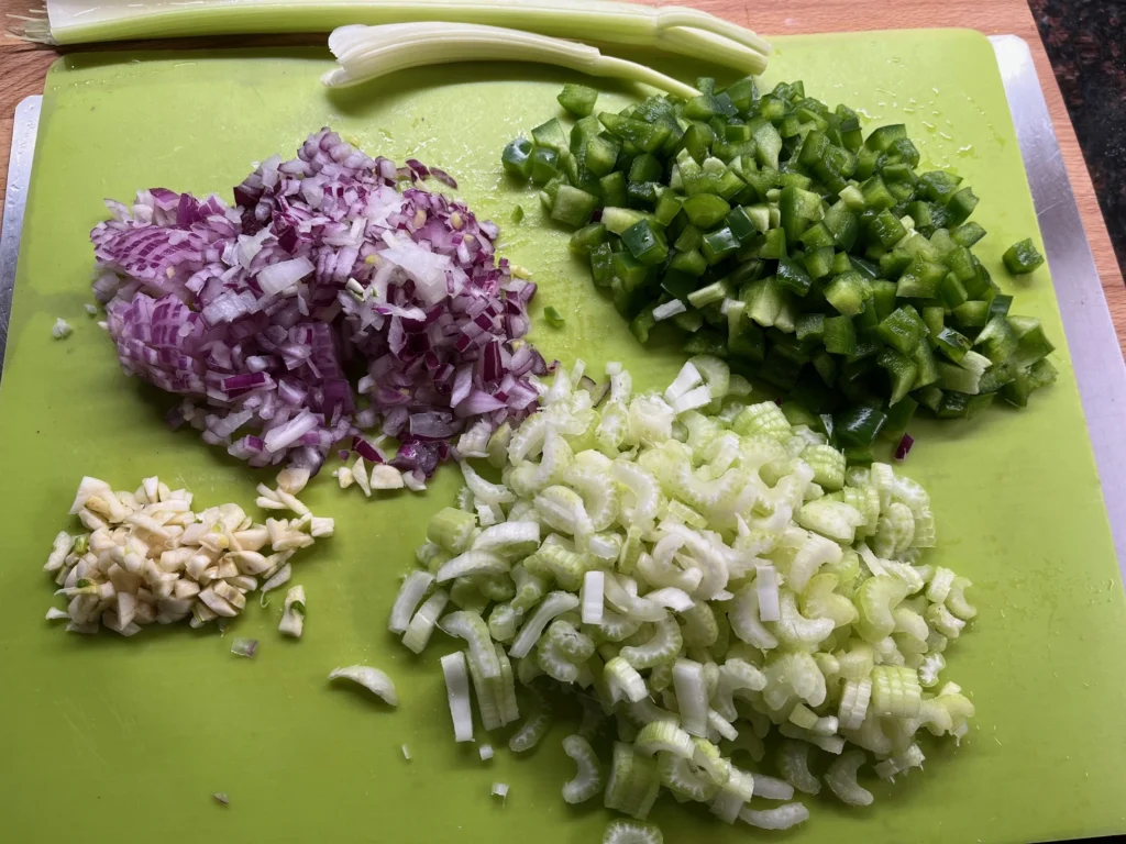 • The Trinity: Onion, green bell pepper, and celery form the backbone of Louisiana cooking. Together, they build the foundation of flavor.